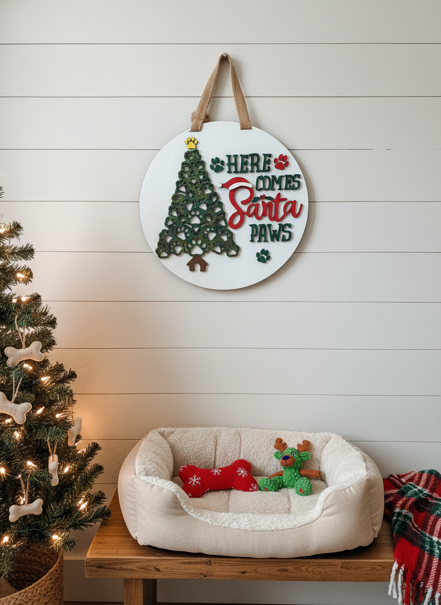 Bring holiday spirit, pet-friendly charm, and festive warmth to your home with our "Here Comes Santa Paws" Paw Print Tree Door Sign, and let it greet your guests with cheer, personality, and seasonal joy.